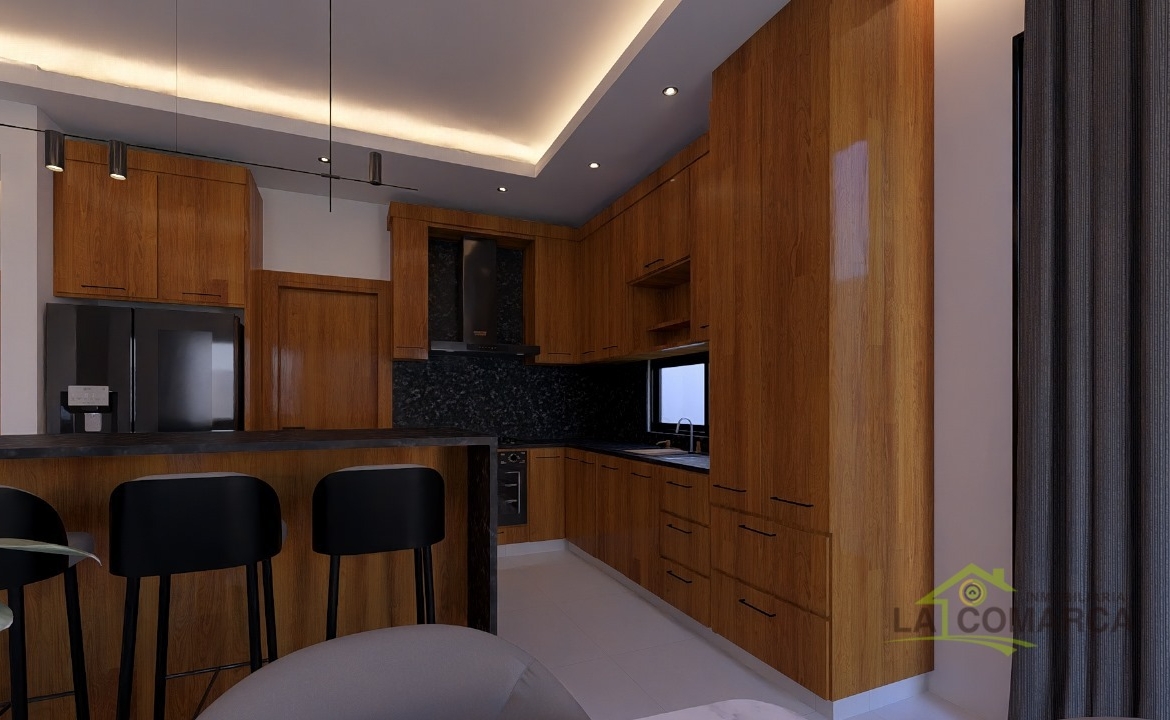- Cocina moderna y equipada: Incluye nevera empotrada y acabados en granito.